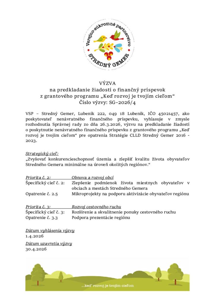 VSP – Stredný Gemer vyhlasuje výzvu na predkladanie žiadostí o poskytnutie nenávratného finančného príspevku z grantového programu „Keď rozvoj je tvojím cieľom".